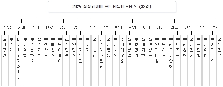 º»¼± Ãâ¹ß ÃѼºÀÌ ¿ï·È°í, ù ´Ü°è¿¡¼ Çѱ¹ÀÌ ¸¸Á·ÇÒ ¸¸ÇÑ ¼ºÀûÇ¥¸¦ ¹Þ¾Æµé¾ú´Ù. 2025 »ï¼ºÈÀç¹è ¿ùµå¹ÙµÏ¸¶½ºÅͽº 32°ÀüÀÌ 9ÀÏ Á¦ÁÖÆ¯º°ÀÚÄ¡µµ ¼±ÍÆ÷½Ã Èִнº ¾ÆÀÏ·£µå 2Ãþ Ưº°´ë±¹Àå¿¡¼ ¹ú¾îÁ³´Ù. 10¸íÀÌ ½Î¿î Çѱ¹Àº 7¸íÀÌ 16°¿¡ ¿Ã¶ú´Ù. ÇÑ-ÁßÀüÀº 7ÆÇÀ̾ú´Âµ¥ Çѱ¹ÀÌ 5ÆÇ¿¡¼ ½Â¸®Çß´Ù. ½ÅÁø¼´Â Áß±¹ÀÇ Á¤»ó±Þ ±â»ç ¸®Ä£Ã»À» °¡º±°Ô À̰å´Ù. ±èÁö¼®Àº Áß±¹ ÃÖÁ¤»ó±Þ ±â»ç ¿Õ½ÌÇÏ¿À¿¡°Ô ¿ªÀü½ÂÀ» °ÅµÎ¾ú´Ù. Çѱ¹ ¹ÙµÏ±¹°¡´ëÇ¥ÆÀ °¨µ¶À» Áö³ÂÀ¸¸ç ½Ã´Ï¾îÁ¶¸¦ Åë°úÇØ º»¼±¿¡ ¿À¸¥ ¸ñÁø¼®Àº 32°Àü¿¡¼ Áß±¹ Æã¸®¾ß¿ÀÀÇ °Å´ëÇÑ ´ë¸¶¸¦ ÀâÀ¸¸é¼ ½Â¸®Çß´Ù. ÀÌÁöÇö-¾È¼ºÁØ ÇÑ-ÇÑÀüÀÌ 1ÆÇ¿¡¼ ÀÌÁöÇöÀÌ ½Â¸®Çß´Ù. ±×¸®°í °µ¿À±ÀÌ ¿ùµåÁ¶ Åë°úÀÚÀÎ º£Æ®³²ÀÇ ÇϲÙÀ©¾È(¾Æ¸¶5´Ü)À» ²ª¾ú´Ù. 18¸íÀÌ ÃâÀüÇÑ Áß±¹Àº ÀÚ±¹·©Å· 1À§ÀÌÀÚ µðÆæµù èÇǾð µùÇÏ¿À, ¾çµù½Å µîÀ» ºñ·ÔÇØ 8¸íÀÌ 16°¿¡ ¿Ã¶ú´Ù. ÀϺ»Àº 2¸í Áß ½Ã¹Ù³ë µµ¶ó¸¶·ç°¡ Áß±¹ ·ùÀ§Ç×À» ²ª°í ´ÙÀ½ ´Ü°è·Î ³ª¾Æ°¬´Ù. ´ë¸¸¿¡¼ Ȧ·Î ÃâÀüÇÑ ½¬ÇÏ¿ÀÈ˰ú ¿ùµåÁ¶¸¦ Åë°úÇÑ º£Æ®³² ÇϲÙÀ©¾Èµµ Å»¶ôÇÏ¸é¼ 16°ºÎÅÍ ÇÑ-Áß-ÀÏ ´ë°á·Î Á¼ÇôÁ³´Ù. 2025 »ï¼ºÈÀç¹è ¿ùµå¹ÙµÏ¸¶½ºÅͽº´Â 9ÀÏ ¿¸®´Â º»¼± 32°ºÎÅÍ ÀÚ±¹ °£ ´ë°áÀ» Çã¿ëÇÏ´Â ¹«ÀÛÀ§ °æÀïÀ» ÆîÄ¡¸ç, 16ÀϺÎÅÍ ½ÃÀÛÇÏ´Â °á½Â 3¹ø±â¿¡¼ ¿ì½ÂÀÚ¸¦ °¡¸°´Ù. »ï¼ºÈÀçÇØ»óº¸Çè(ÁÖ)ÀÌ ÈÄ¿øÇϰí Áß¾ÓÀϺ¸°¡ ÁÖÃÖÇÏ´Â 2025 »ï¼ºÈÀç¹è ¿ùµå¹ÙµÏ¸¶½ºÅͽºÀÇ ¿ì½Â»ó±ÝÀº 3¾ï ¿ø, ÁØ¿ì½Â »ó±ÝÀº 1¾ï ¿øÀÌ´Ù. »ý°¢½Ã°£Àº °¢ÀÚ 2½Ã°£¿¡ ÃÊÀбâ 1ºÐ 5ȸ¸¦ ÁØ´Ù. ¢Ã 2025 »ï¼ºÈÀç¹è ¿ùµå¹ÙµÏ¸¶½ºÅͽº 32° °á°ú (¿ÞÂÊ ¼±¼ö°¡ ½Â¸®) ùÛ±èÁö¼®-ñé¿Õ½ÌÇÏ¿À: 231¼ö ÈæºÒ°è½Â ùÛÀÌÁöÇö-ù۾ȼºÁØ: 238¼ö ¹éºÒ°è½Â ùÛ°µ¿À±-[º£]ÇϲÙÀ©¾È: 189¼ö ÈæºÒ°è½Â ùÛ¸ñÁø¼®-ñéÆã¸®¾ß¿À: 199¼ö ÈæºÒ°è½Â ùÛ¹Ú»óÁø-ñé¼ÎÄ¿: 326¼ö Èæ0.5Áý½Â ùÛ½ÅÁø¼-ñ鸮ģû: 205¼ö ÈæºÒ°è½Â ùÛ¹ÚÁ¤È¯-ñ齺¿þ: 204¼ö ¹éºÒ°è½Â ñéȲ¹ÖÀ§-ùÛº¯»óÀÏ: 176¼ö ¹éºÒ°è½Â ñé´çÀÌÆäÀÌ-ù۽ŹÎÁØ: 167¼ö ÈæºÒ°è½Â ñéµùÇÏ¿À-ñé¾çÄ«ÀÌ¿ø: 214¼ö ¹éºÒ°è½Â ñé·Ë»þ¿À-ñ鿹â½Å: 167¼ö ÈæºÒ°è½Â ñéǪÁ¨Çë-ñéÁøÀ§Ã»: 207¼ö ÈæºÒ°è½Â ñé·ª¿ÀÀ§¾ÈÇã-ñéÅÁÀÚ¿ø:164¼ö ¹éºÒ°è½Â ñé¾çµù½Å-ìí½¬ÀÚÀ§¾È: 138¼ö ¹éºÒ°è½Â ñéź»þ¿À-Óæ½¬ÇÏ¿ÀÈË: 185¼ö ¹é½Ã°£½Â ìí½Ã¹Ù³ë µµ¶ó¸¶·ç-ñé·ùÀ§Ç×: 187¼ö ÈæºÒ°è½Â ![]() ¢Ã 16° ´ëÁø (»ó´ëÀüÀû: ¿ÞÂÊ ±âÁØ) (10ÀÏ ´ë±¹) ùÛ¹ÚÁ¤È¯-ìí½Ã¹Ù³ë µµ¶ó¸¶·ç: 8½Â2ÆÐ ùÛ±èÁö¼®-ñé·Ë»þ¿À: 3½Â8ÆÐ ñé´çÀÌÆäÀÌ-ñé¾çµù½Å ùÛ¹Ú»óÁø-ùÛ°µ¿À±: 1½Â1ÆÐ (11ÀÏ´ë±¹) ñéź»þ¿À-ñéȲ¹ÖÀ§ ùÛÀÌÁöÇö-ñéµùÇÏ¿À: 1½Â2ÆÐ ùÛ½ÅÁø¼-ñé·ª¿ÀÀ§¾ÈÇã-: 6½Â1ÆÐ ñéǪÁ¨Çë-ùÛ¸ñÁø¼®: ù °ø½Ä ´ë°á ![]() ¡ã 30ÁÖ³âÀ» ¸ÂÀº »ï¼ºÈÀç¹è ¿ùµå¸¶½ºÅͽº°¡ Á¦ÁÖµµ¿¡¼ ÁøÇàµÇ°í ÀÖ´Ù.
