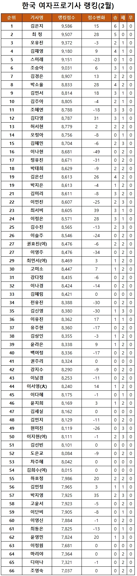 ¿©ÀÚ·©Å· 1À§ ÀÚ¸®¸¦ ³õ°í °æÀïÀ» À̾°í ÀÖ´Â ÃÖÁ¤ 9´ÜÀº ÀÌ´Þ 5Àü Àü½ÂÀ» ±â·ÏÇϸç 5°è´Ü »ó½ÂÇÑ Á¾ÇÕ 28À§(9507Á¡)¿¡ ·©Å©, ±èÀºÁö 9´ÜÀÇ µÚ¸¦ ¹Ù¦ Ãß°ÝÇϰí ÀÖ´Ù.