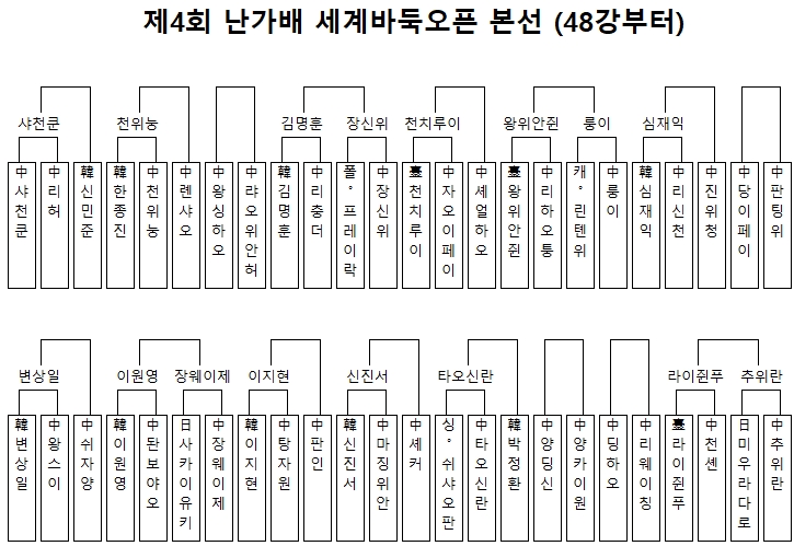 48°Àü¿¡ ÃâÀüÇÑ Çѱ¹ ¼±¼ö 7¸í Áß 6¸íÀÌ 32°Àü¿¡ ÁøÃâÇÏ¸ç ¼øÁ¶·Î¿î Ãâ¹ßÀ» º¸¿´´Ù. 14ÀÏ Áß±¹ ÃëÀú¿ì ´ÙÈÀ§¾È ÀÎÅͳ»¼Å³Î È£ÅÚ¿¡¼ ¿¸° Á¦4ȸ ³°¡¹è ¼¼°è¹ÙµÏ¿ÀÇ 48°Àü¿¡¼ ½ÅÁø¼¡¤º¯»óÀÏ 9´ÜÀ» ºñ·ÔÇØ 6¸í Çѱ¹ ±â»ç°¡ 32°Àü¿¡ ¿Ã¶ú´Ù. Çѱ¹ ¼±¼ö Àü¿øÀÌ Áß±¹°ú ´ë°áÇÑ 48°Àü¿¡¼ Çѱ¹·©Å· 1À§ ½ÅÁø¼ 9´ÜÀº ¸¶Â¡À§¾È 7´ÜÀ», 4À§ º¯»óÀÏ 9´ÜÀº ¿Õ½ºÀÌ 8´ÜÀ» Á¥È÷°í 32° ÁøÃâ¿¡ ¼º°øÇß´Ù. ÀÌ ¹Û¿¡ 5À§ ±è¸íÈÆ 9´ÜÀº ¸®Ãæ´õ 4´ÜÀ», 14À§ ÀÌÁöÇö 9´ÜÀº ÅÁÀÚ¿ø 7´ÜÀ», 40À§ ÀÌ¿ø¿µ 9´ÜÀº µÃº¸¾ß¿À 8´ÜÀ», 44À§ ½ÉÀçÀÍ 7´ÜÀº ¸®½Åõ 5´Ü¿¡°Ô ½Â¸®Çϸç 32° ƼÄÏÀ» ¼Õ¿¡ Áã¾ú´Ù. ½Ã´Ï¾îÁ¶¿¡¼ ¿Ã¶ó¿Â ÇÑÁ¾Áø 9´ÜÀº õÀ§´± 8´Ü¿¡°Ô ¸·È÷¸ç Å»¶ôÇß´Ù. 48°Àü »ýÁ¸ÀÚ 16¸íÀº 32° ½Ãµå 16¸í(Áß±¹ 14Àå, Çѱ¹ 2Àå)°ú ÇÔ²² 32°ÀüÀ» Ä¡¸£°Ô µÈ´Ù. 32° ±¸¼ºÀº Çѱ¹Àº ½Ãµå 2¸í(¹ÚÁ¤È¯¡¤½Å¹ÎÁØ)À» Æ÷ÇÔÇØ ÃÑ 8¸í, Áß±¹Àº 21¸í, ÁßÈŸÀ̺£ÀÌ 3¸íÀÌ´Ù. ÀϺ»°ú Æú¶õµå, ij³ª´Ù, ½Ì°¡Æ÷¸£´Â 48°ÀÇ º®À» ³ÑÁö ¸øÇϰí Àü¿ø Å»¶ôÇß´Ù. ´ë±¹ Á¾·á Á÷ÈÄ ÁøÇàµÈ 32° ´ëÁø Ãß÷ °á°ú, 48°Àü°ú ¸¶Âù°¡Áö·Î Çѱ¹ ¼±¼ö 8¸íÀº ¸ðµÎ Áß±¹ ¼±¼ö¿Í ´ë°áÀÌ ¼º»çµÆ´Ù. ½ÅÁø¼ 9´ÜÀº ¼ÎÄ¿ 9´Ü, ¹ÚÁ¤È¯ 9´ÜÀº Ÿ¿À½Å¶õ 9´Ü, º¯»óÀÏ 9´ÜÀº ½¬ÀÚ¾ç 9´Ü, ½Å¹ÎÁØ 9´ÜÀº »þõÄï 8´Ü, ±è¸íÈÆ 9´ÜÀº Àå½ÅÀ§ 5´Ü°ú ¸ÂºÙ´Â´Ù. À̾î ÀÌÁöÇö 9´ÜÀº ÆÇÀÎ 9´Ü, ÀÌ¿ø¿µ 9´ÜÀº Àå¿þÀÌÁ¦ 9´Ü, ½ÉÀçÀÍ 7´ÜÀº ÁøÀ§Ã» 9´Ü°ú 16° ƼÄÏÀ» ´ÙÅ÷´Ù. »ó´ëÀüÀûÀº ½ÅÁø¼¡¤¹ÚÁ¤È¯ 9´ÜÀÌ °¢°¢ 2½Â 1ÆÐ·Î ¾Õ¼ ÀÖ°í, ½Å¹ÎÁØ¡¤ÀÌÁöÇö 9´ÜÀº µ¿·ü, ±è¸íÈÆ 9´ÜÀº ù ´ë°áÀÌ¸ç ³ª¸ÓÁö ¼±¼öµéÀº ´Ù¼Ò ¿¼¼¸¦ º¸À̰í ÀÖ´Ù. À̾îÁö´Â 32°ÀüÀº 15ÀÏ °°Àº Àå¼Ò¿¡¼ ¼ÓÇàÇÑ´Ù. ÀÌÈÄ 16°ÀüÀº ¿À´Â 10¿ù 9ÀÏ ÁøÇàµÉ ¿¹Á¤ÀÌ´Ù. Á¦4ȸ ³°¡¹è ¼¼°è¹ÙµÏ¿ÀÇÂÀÇ ¿ì½Â »ó±ÝÀº 180¸¸ À§¾È(¾à 3¾ï 8800¸¸ ¿ø)À̸ç, ÁØ¿ì½Â »ó±ÝÀº 60¸¸ À§¾È(¾à 1¾ï 2900¸¸ ¿ø)ÀÌ´Ù. Áß±¹¹ÙµÏ±ÔÄ¢À» Àû¿ëÇØ ´ýÀº 7Áý¹ÝÀ̸ç, »ý°¢½Ã°£À¸·Î´Â °¢ÀÚ 2½Ã°£¿¡ ÃÊÀбâ 60ÃÊ 5ȸ¸¦ ÁØ´Ù. ¡ßÁ¦4ȸ ³°¡¹è º»¼± 48° Çѱ¹ ¼±¼ö ´ë±¹ °á°ú(¿ÞÂÊÀÌ ½ÂÀÚ) ½ÅÁø¼ 9´Ü vs ¸¶Â¡À§¾È 7´Ü(Áß±¹) - 227¼ö ³¡, Èæ ºÒ°è½Â º¯»óÀÏ 9´Ü vs ¿Õ½ºÀÌ 8´Ü(Áß±¹) - 234¼ö ³¡, ¹é ºÒ°è½Â ±è¸íÈÆ 9´Ü vs ¸®Ãæ´õ 4´Ü(Áß±¹) - 132¼ö ³¡, ¹é ºÒ°è½Â ÀÌÁöÇö 9´Ü vs ÅÁÀÚ¿ø 7´Ü(Áß±¹)- 212¼ö ³¡, Èæ ºÒ°è½Â ÀÌ¿ø¿µ 9´Ü vs µÃº¸¾ß¿À 8´Ü(Áß±¹) - 301¼ö ³¡, Èæ 3Áý¹Ý½Â ½ÉÀçÀÍ 7´Ü vs ¸®½Åõ 5´Ü(Áß±¹) - 196¼ö ³¡, ¹é ºÒ°è½Â õÀ§´± 8´Ü(Áß±¹) vs ÇÑÁ¾Áø 9´Ü – 238¼ö ³¡, ¹é ºÒ°è½Â ![]() ¡ßÁ¦4ȸ ³°¡¹è º»¼± 32° Çѱ¹ ¼±¼ö ´ëÁø ¹× »ó´ëÀüÀû(¿ÞÂÊ ±âÁØ) ½Å¹ÎÁØ 9´Ü vs »þõÄï 8´Ü(Áß±¹) - 2½Â 2ÆÐ ±è¸íÈÆ 9´Ü vs Àå½ÅÀ§ 5´Ü(Áß±¹) - ù ´ë°á ½ÉÀçÀÍ 7´Ü vs ÁøÀ§Ã» 9´Ü(Áß±¹) - 0½Â 2ÆÐ º¯»óÀÏ 9´Ü vs ½¬ÀÚ¾ç 9´Ü(Áß±¹) - 1½Â 3ÆÐ ÀÌ¿ø¿µ 9´Ü vs Àå¿þÀÌÁ¦ 9´Ü(Áß±¹) - 0½Â 2ÆÐ ÀÌÁöÇö 9´Ü vs ÆÇÀÎ 9´Ü(Áß±¹) - 1½Â 1ÆÐ ½ÅÁø¼ 9´Ü vs ¼ÎÄ¿ 9´Ü(Áß±¹) - 2½Â 1ÆÐ ¹ÚÁ¤È¯ 9´Ü vs Ÿ¿À½Å¶õ 9´Ü(Áß±¹) - 2½Â 1ÆÐ ![]() [48°Àü] ùÛ½ÅÁø¼(½Â)-ñ鸶¡À§¾È.