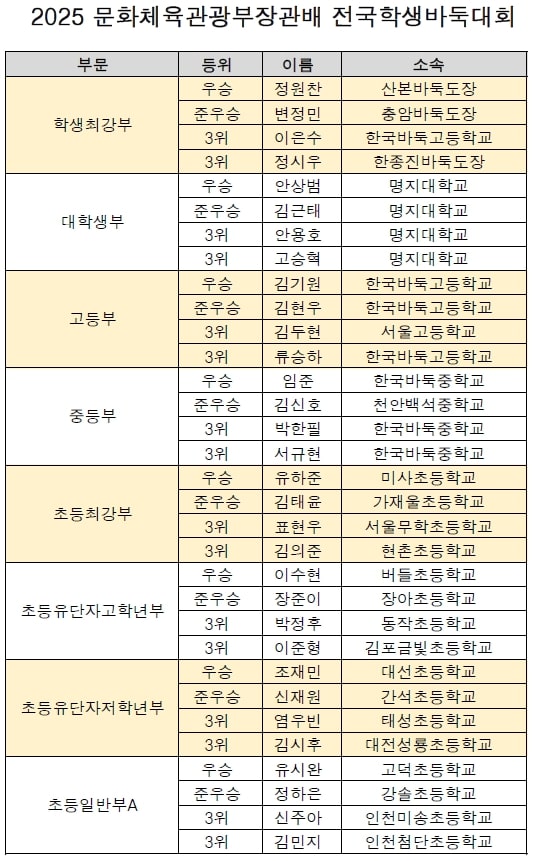 À̹ۿ¡ ´ëÇлýºÎ¿¡¼­´Â ¾È»ó¹ü(¸íÁö´ë) ¼±¼ö°¡ Á¤»ó¿¡ ¿Ã¶úÀ¸¸ç, °íµîºÎ ±è±â¿ø(Çѱ¹¹ÙµÏ°í), ÁßµîºÎ ÀÓÁØ(Çѱ¹¹ÙµÏÁß), ÃʵîÃÖ°­ºÎ À¯ÇÏÁØ(¹Ì»çÃÊ), ÃʵîÀ¯´ÜÀÚ °íÇгâºÎ À̼öÇö(¹öµéÃÊ), ÃʵîÀ¯´ÜÀÚ ÀúÇгâºÎ Á¶Àç¹Î(´ë¼±ÃÊ), Ãʵî ÀϹݺΠÀ¯½Ã¿Ï(°í´öÃÊ) ±ºÀÌ °¢°¢ ºÎ¹®º° ¿ì½ÂÀ» Â÷ÁöÇß´Ù.