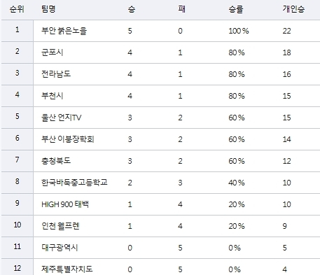 2Â÷ °æ±â±îÁö 5¶ó¿îµå°¡ Á¾·áµÈ ÇöÀç KBF¹ÙµÏ¸®±×´Â ºÎ¾È ºÓÀº³ëÀ»ÀÌ 5Àü Àü½ÂÀ¸·Î ´Üµ¶ ¼±µÎ¿¡ ³ª¼± °¡¿îµ¥ ±ºÆ÷½Ã, Àü¶ó³²µµ, ºÎõ½Ã°¡ °¢°¢ 4½Â 1ÆÐ·Î ¼±µÎ¸¦ ¹Ù¦ µÚÂÑ´Â ¸ð¾ç»õ´Ù.