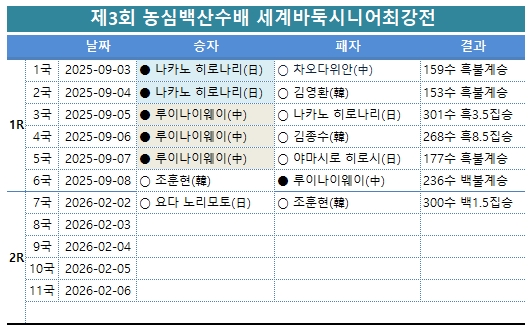 Áß±¹ ·çÀ̳ªÀÌ¿þÀÌ 9´ÜÀÇ 4¿¬½ÂÀ» ÀúÁöÇß´ø Çѱ¹ Á¶ÈÆÇö 9´ÜÀÌ ¾Æ½±°Ôµµ 2¿¬½Â¿¡´Â À̸£Áö ¸øÇß´Ù. 2ÀÏ Áß±¹ ¼±Àü Èúư ǪÅã È£ÅÚ¿¡¼­ ÆîÄ£ Á¦3ȸ ³ó½É¹é»ê¼ö¹è 2Â÷Àü 7±¹¿¡¼­ Çѱ¹ ¼¼ ¹øÂ° ÁÖÀÚ Á¶ÈÆÇöÀº ÀϺ» ¼¼ ¹øÂ° ¿ä´Ù ³ë¸®¸ðÅä¿¡°Ô 300¼ö ¸¸¿¡ ÈæÀ¸·Î 1.5Áý ÆÐÇß´Ù.