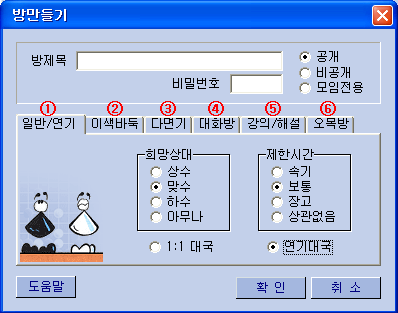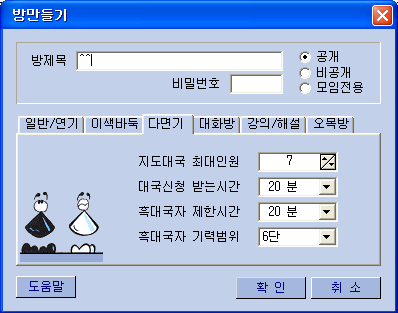 ¹æÀ» ¸¸µé ¶§ ´ë±¹½Åû ¹Þ´Â½Ã°£, Èæ´ë±¹ÀÚ Á¦Çѽð£, Áöµµ´ë±¹ ÃÖ´ëÀοø µîÀ» ¼³Á¤À» ÇÒ ¼ö ÀÖ½À´Ï´Ù. ÁöµµÀÚ(¹é)´Â ¿©·¯ ´ë±¹ÁßÀÎ ´ë±¹ÀÚÁß ÂøÁ¡ ¼ø¼¿¡ µû¶ó ±× ÇØ´çÆÇÀÌ È¸é¿¡ ³ªÅ¸³ª¸ç, ÂøÁ¡À» ÇÏ¸é ´Ù¸¥ ´ë±¹ÀÚÀÇ ´ë±¹È¸éÀÌ ÀÚµ¿À¸·Î ȸ鿡 ³ªÅ¸³³´Ï´Ù.