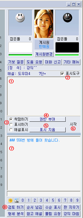 ¨ç : °ÀÇ ÁøÇàÀÚ°¡ ÀûÀº ±ÛÀÌ ÀûÈ÷´Â ºÎºÐ ¨è : ¾Æ·¡ ¸Þ´ºµéÀ» º¸ÀÌ°Ô ÇÒÁö, ¾Èº¸ÀÌ°Ô ÇÒÁö¸¦ ¼±Åà ¨é : 'ÂøÁ¡Çϱâ'-°ÀÇÇÒ ¼ö¼ø ÀԷ»óÅÂ, 'Ç¥½ÃÇϱâ' - A, B µî ƯÁ¤ À§Ä¡¸¦ ¾ËÆÄºªÀ¸·Î Ç¥½Ã'ÇØ¼³Ç¥½Ã' - ƯÁ¤ À§Ä¡ÀÇ ÁÁ°í ³ª»Û Æò°¡°ªÀ» Ç¥½Ã ¨ê : °üÀüÀÚ Áß ÇѸíÀ» ÁöÁ¤ÇØ Âø¼öÇÒ ±ÇÇÑÀ» ºÎ¿© '±ÇÇѺο©' ¹öưÀ» ´©¸¥ ÈÄ ¨íâ¿¡¼ ´ëȸíÀ» Ŭ¸¯ ±ÇÇѺο© ÇÏ¸é µË´Ï´Ù. ±ÇÇÑ ºÎ¿© ÈÄ '±ÇÇÑ ÇØÁ¦'·Î ¹Ù²ï ¹öưÀ» ´©¸£½Ã¸é ÁÖ¾îÁø ±ÇÇÑÀ» ÀϰýÀûÀ¸·Î ¸ðµÎ ȸ¼öÇÏ°Ô µË´Ï´Ù. ¨ë : ¨éÀÇ 'Ç¥½ÃÇϱâ'¿Í 'ÇØ¼³Ç¥½Ã'·Î ¸¶Å©µÈ ³»¿ëÀ» ÀϰýÀûÀ¸·Î Áö¿ì°Ô ÇØÁÝ´Ï´Ù. ¨ì : °üÀüÀڵ鿡°Ô ´ÙÀ½ ¼ö Âø¼öÁ¡À» ¿¹ÃøÇØ º¸µµ·Ï ÇÒ ¼ö ÀÖ½À´Ï´Ù..°üÀüÀÚµéÀÌ Âø¼öÇÑ Âø¼öÁ¡Àº Ä«¿îÆ®°¡ µÇ¾î º¸¿©Áý´Ï´Ù. °¢ ¼ö¿¡ ´ëÇØ¼´Â ÇØ¼³Ç¥½Ã ±â´ÉÀ» ÅëÇØ °ÀÇ ÁøÇàÀÚ°¡ Æò°¡ÇØ ÁÙ ¼ö ÀÖ½À´Ï´Ù. ¨í : °üÀüÀÚ°¡ ÀÔ·ÂÇÏ´Â ±ÛÀÌ ³ªÅ¸³ª´Â ºÎºÐÀÔ´Ï´Ù.(Áú¹® µî) ¨î : °ÀÇ ÁøÇàÀÚ°¡ ³õ¾Æº¸±â ÇÒ ¼ö ÀÖµµ·Ï ÇÏ´Â ¹öưÀ¸·Î ³õ¾Æº¸±â ÇÏ´Â ¸ðµç ¼ö´Â °üÀüÀÚ¿¡°Ô º¸¿©Áý´Ï´Ù. '°ËÅäÇϱâ' »óÅ¿¡¼ Âø¼öÇÑ ¼ö´Â ¼ö¼øÀÌ Ç¥½ÃµË´Ï´Ù. [±×¸²11] °ÀÇ½Ç °ÀÇ ÁøÇàÀÚ ¸Þ´º