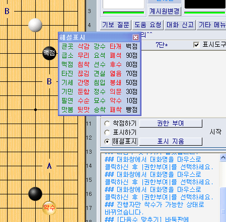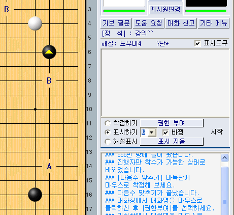 [±×¸²13] 'ÇØ¼³ Ç¥½Ã' ½Ã ³ª¿À´Â ¸Þ´º ¹æ °³¼³ ÈÄ ¨éÀÇ »óÅ´ 'ÂøÁ¡Çϱ⡯ »óÅ·Π¹ÙµÏÆÇ À§¸¦ Ŭ¸¯Çϸé ÂøÁ¡ÀÌ µË´Ï´Ù. °ÀÇ ÇϰíÀÚ ÇÏ´Â ¼ö¸¦ ÂøÁ¡ÇÑ ÈÄ 'Ç¥½ÃÇϱâ'¸¦ ¼±ÅÃÇϰí A, B ¸¶Å©¸¦ ÂïÀ» ¼öµµ ÀÖ°í, 'ÇØ¼³ Ç¥½Ã'¸¦ ¼±ÅÃÇÏ°í °¢°¢ÀÇ ÂøÁ¡À§Ä¡¿¡ ´ëÇÑ ¼³¸íÀ» ÇÒ ¼ö ÀÖ½À´Ï´Ù. [±×¸²14] 'Ç¥½ÃÇϱâ' ±â´É»ç¿ë 'Ç¥½ÃÇϱ⡯ ¿· ¡®¹Ù²ñ¡¯ÀÇ Ã¼Å©¸¦ ¾ø¾Ö¸é µ¿ÀÏÇÑ ¾ËÆÄºªÀ¸·Î Ç¥½ÃÇÒ ¼ö ÀÖ½À´Ï´Ù. [±×¸²15] 'ÇØ¼³Ç¥½Ã' ±â´É»ç¿ë ƯÁ¤ °üÀüÀÚÀÇ Áú¹®ÀÌ µé¾î¿À°Å³ª, ƯÁ¤ °üÀüÀÚ¿¡°Ô ¿©±â¼ ¾î¶»°Ô Çϸé ÁÁÀ»±î¿ä? ÇÏ´Â Áú¹® µîÀÌ ¿À´Â °æ¿ì¿¡ [±×¸²12]¿Í°°ÀÌ '±ÇÇÑ ºÎ¿©' ¹öưÀ» Ŭ¸¯ÇÏ¿© ƯÁ¤Àο¡°Ô Âø¼ö±ÇÇÑÀ» ºÎ¿©ÇÏ¿© °°ÀÌ ¶Ç´Â °üÀüÀÚ¿¡°Ô¸¸ Âø¼öÇØ º¸µµ·Ï ÇÒ ¼ö ÀÖ½À´Ï´Ù. ÀÌ ¶§ ±ÇÇÑÀ» ºÎ¿©¹ÞÀº °üÀüÀÚ¸¸ Âø¼ö¸¦ ÇÒ ¼ö ÀÖ½À´Ï´Ù. [±×¸²16] '±ÇÇѺο©' ½Ã ±ÇÇÑ ºÎ¿©ÇϰíÀÚ ÇÏ´Â Âü¿©ÀÚ ´ëȸíÀ» Ŭ¸¯ÇÑ °æ¿ì ±ÇÇѺο© ÈÄ °ËÅä»óÅ¿¡¼µµ 'ÂøÁ¡', 'Ç¥½ÃÇϱâ', 'ÇØ¼³Ç¥½Ã'°¡ °¡´ÉÇÕ´Ï´Ù.