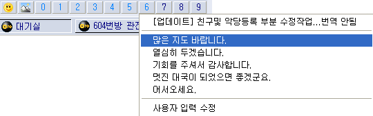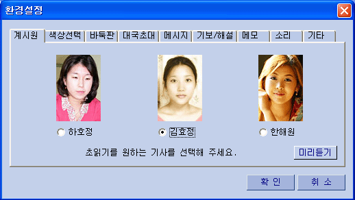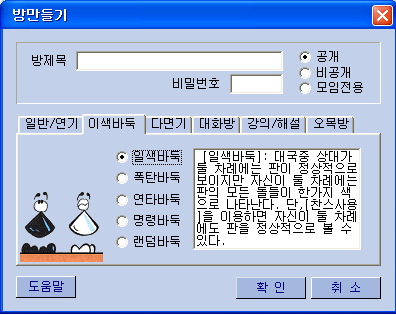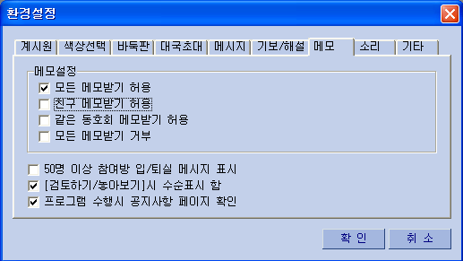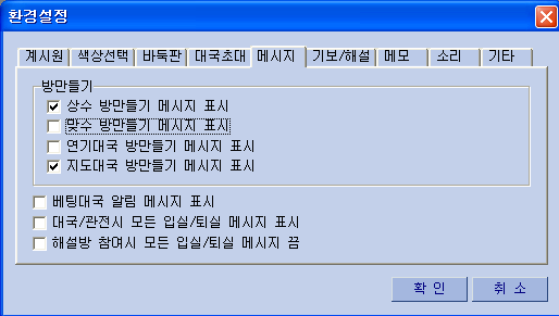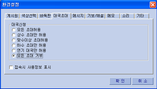 3) ¹ÙµÏÆÇ : ¿øÇϽô ¹ÙµÏÆÇ ¹«´Ì¸¦ ¸¶¿ì½º·Î Ŭ¸¯ [±×¸²28] 4) ´ë±¹ÃÊ´ë : ´ë±¹ ¿øÇÏ´Â »ó´ë¸¦ ÃÊ´ëÇã¿ë/°ÅºÎ½Ã »ç¿ë [±×¸²29] 5) ¸Þ½ÃÁö : ¹æ¸¸µé±â ÇÒ¶§ ´ë±â½Ç â¿¡ ¹æ¸¸µé±â ¸Þ½ÃÁö Ç¥½Ã¿©ºÎ [±×¸²30] 6) ±âº¸/ÇØ¼³ : ´ë±¹Áß ÀÔ½ÇÇÏ¿© °üÀüÇÒ¶§ Âü°íµµ Ç¥½Ã¿©ºÎ ¼±ÅýÃ, º»Àα⺸¿Í °üÀü±âº¸ ÀÚµ¿ÀúÀå ¿©ºÎ [±×¸²30] 7) ¸Þ¸ð : ¸Þ¸ð¼³Á¤½Ã ¿øÇÏ´Â ¸Þ¸ð¹Þ±â¸¦ ¼³Á¤ÇÒ¶§ »ç¿ë [±×¸²31]