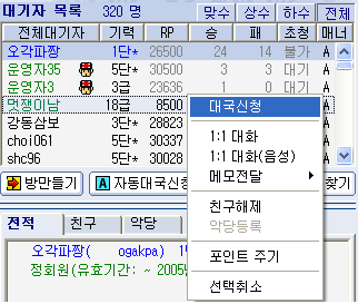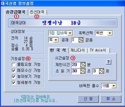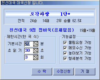 5. ÀüÀû°ü¸® °¢ ȸ¿øÀÇ ÀüÀûÀº ÃÑÀüÀû°ú Åë»ê·¹ÀÌÆÃÀüÀû ±×¸®°í ÃÖ±Ù ·¹ÀÌÆÃÀüÀûÀ¸·Î °ü¸®µË´Ï´Ù. ÃÑÀüÀûÀº °¢ ȸ¿øÀÌ ¿À·Î¹ÙµÏ½Ç¿¡¼ ÀÌ·ç¾îÁø ¸ðµç ´ë±¹¿¡ ´ëÇÏ¿© ´©ÀûµÈ ÀüÀûÀ¸·Î '½Â', 'ÆÐ', '¹«'·Î ³ªÅ¸³³´Ï´Ù. Åë»ê·¹ÀÌÆÃÀüÀûÀº ÀÚµ¿½Â°±Þ¿¡ Àû¿ëµÇ´Â ·¹ÀÌÆÃ´ë±¹¿¡ °üÇÑ ÀüÀûÀ¸·Î '½Â', 'ÆÐ', '¹«'·Î º¸¿©ÁÝ´Ï´Ù. (´Ü, 1:1 ´ë±¹¿¡ ÇÑÇϸç 2Á¡À» ÃʰúÇÏ´Â Á¢¹ÙµÏÀº Á¦¿Ü, 50¼öÀÌ»ó ´ë±¹¿¡¼¸¸ ·¹ÀÌÆÃ ÀüÀû¹Ý¿µ) ÃÖ±Ù ·¹ÀÌÆÃÀüÀûÀº ÃÖ±Ù20±¹¿¡ ´ëÇÑ ·¹ÀÌÆÃ ÀüÀû °á°ú¸¦ '½Â', 'ÆÐ', '¹«'·Î º¸¿©ÁÝ´Ï´Ù. * * ÀÚµ¿ÆÐ ±ÔÁ¤: Á¢¼ÓÀÌ ²÷°Ü ´ë±¹ÀÌ ÁߴܵǾúÀ» °æ¿ì 5ºÐ ¾È¿¡ ÀÔ½ÇÇÏ¿© ´ë±¹À» ÇÏÁö ¾ÊÀ¸¸é ÆÐ·Î 󸮵˴ϴÙ.