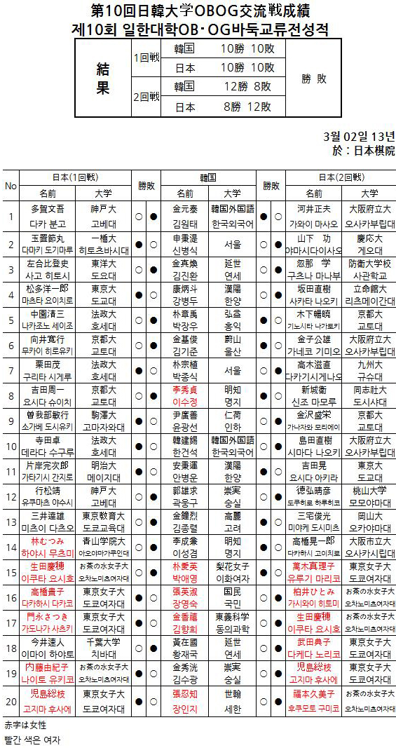 ´ëȸ´Â 20¸í ´ë 20¸íÀÌ °Ü·ç´Â ´ÜüÀü. ÀϺ» 40¸í, Çѱ¹ 20¸íÀÌ ¿ÀÀü°ú ¿ÀÈÄ·Î ³ª´² 1¤ý2ȸÀüÀ» ÆîÄ£ °á°ú Çѱ¹ÀÌ 22½Â 18ÆÐ·Î ½Â¸®Çß´Ù. ÀϺ»Àº ¿ÀÀü¿¡´Â ÁÖ·Î °üµ¿ÀÇ ´ëÇйٵÏÀÎÀÌ, ¿ÀÈÄ¿£ ÁÖ·Î °ü¼Áö¿ªÀÇ ´ëÇйٵÏÀÎÀÌ ´ë±¹ÇØ ¿ÀÀü°ú ¿ÀÈÄÀÇ ¼±¼ö°¡ ´Þ¶ú´Ù. Á¦Çѽð£ 1½Ã°£¿¡ 30ÃÊ ÃÊÀбâ 3ȸ, ÃÑÈ£¼±(´ý6Áý¹Ý). ³Ë³ËÇÑ ½Ã°£Àε¥µµ, ¼Ó±âÈ Ãß¼¼¸¦ ¹ÝÁõÇϵíÀÌ Âü°¡ÀÚ ´ëºÎºÐÀº Á¦Çѽð£À» ¸ðµÎ »ç¿ëÇÏÁö ¾Ê°íµµ ´ë±¹À» ÀÏÂï ³¡³»´Â ¸ð½ÀÀ» º¸¿´´Ù.