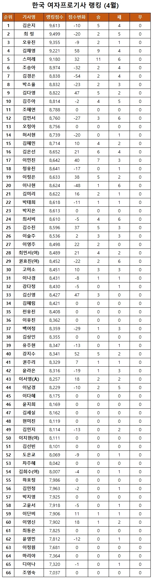 ¿©ÀÚ·©Å·¿¡¼­´Â ±èÀºÁö 9´ÜÀÌ 1À§¸¦ Áö۸ç 5°³¿ù ¿¬¼Ó Á¤»ó ÀÚ¸®¸¦ À¯ÁöÇß´Ù.