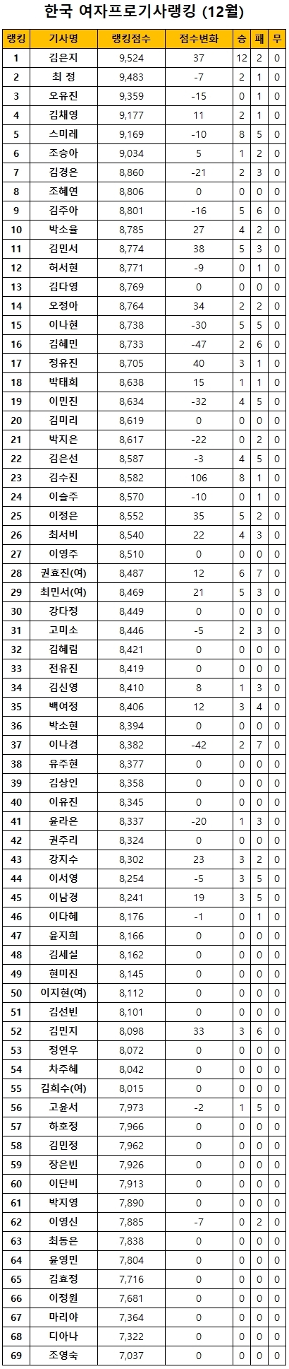 ±èÀºÁö 9´ÜÀÌ 12¿ù ¿©ÀÚ·©Å· 1À§¸¦ Â÷ÁöÇϸç ÇÑ ´Þ ¸¸¿¡ Á¤»ó ÀÚ¸®¸¦ µÇã¾Ò´Ù. 11¿ù ÇÑ ´Þ µ¿¾È 12½Â 2ÆÐ¸¦ ±â·ÏÇÑ ±èÀºÁö 9´ÜÀº ·©Å·Á¡¼ö 9524Á¡, Á¾ÇÕ 26À§¸¦ ±â·ÏÇÏ¸ç °³ÀÎ ÃÖ°í ·©Å·À» °æ½ÅÇß´Ù. ÀÌ ±â°£ ±èÀºÁö 9´ÜÀº Á¦9ȸ ÇØ¼º ¿©Àڱ⼺Àü ¿ì½Â µî ÀλóÀûÀΠȰ¾àÀ» ÆîÃÆ´Ù. ÃÖÁ¤ 9´ÜÀº 11¿ù ÇÑ ´Þ°£ 2½Â 1ÆÐ¸¦ ±â·ÏÇÏ¸ç ·©Å·Á¡¼ö 9483Á¡À» ¹Þ¾Æ µÎ °è´Ü Ç϶ôÇÑ Á¾ÇÕ 30À§, ¿©ÀÚ·©Å· 2À§¿¡ ¿Ã¶ú´Ù. µÎ ±â»ç´Â ¿ÃÇØ ¿©ÀÚ·©Å· 1À§ ÀÚ¸®¸¦ ÁÖ°í¹ÞÀ¸¸ç Ä¡¿ÇÑ °æÀïÀ» À̾°í ÀÖ´Ù. ±èÀºÁö¤ýÃÖÁ¤ 9´Ü¿¡ ÀÌ¾î ¿ÀÀ¯Áø(52À§)¤ý±è俵(93À§) 9´ÜÀÌ °¢°¢ ¿©ÀÚ·©Å· 3À§¿Í 4À§¸¦ Â÷ÁöÇß°í, ½º¹Ì·¹ 4´ÜÀº 11¿ù 8½Â 5ÆÐÀÇ ¼ºÀûÀ¸·Î Á¾ÇÕ·©Å· 97À§, ¿©ÀÚ·©Å· 5À§¸¦ ±â·ÏÇß´Ù. ÇÑÆí ½ÅÁø¼ 9´ÜÀº 4½Â 1ÆÐ¸¦ ±â·ÏÇÏ¸ç ·©Å·Á¡¼ö 10413Á¡À¸·Î 72°³¿ù ¿¬¼Ó Çѱ¹·©Å· 1À§¸¦ ÁöŰ¸ç ¿ª´ë ÃÖÀå±â 1À§ ±â·ÏÀ» °è¼Ó À̾´Ù. µÚÀÌ¾î ¹ÚÁ¤È¯¤ýº¯»óÀÏ 9´ÜÀÌ °¢°¢ 2À§¿Í 3À§¸¦ À¯ÁöÇß°í, ½Å¹ÎÁØ 9´Ü°ú ÀÌÁöÇö 9´ÜÀº ¸ðµÎ ÇÑ °è´Ü »ó½ÂÇϸç 4À§¿Í 5À§¿¡ ¿Ã¶ú´Ù. ¾È¼ºÁØ 9´ÜÀº µÎ °è´Ü Ç϶ôÇÑ 6À§, ±èÁö¼® 9´ÜÀº µÎ °è´Ü »ó½ÂÇÑ 7À§¿¡ ÀÚ¸®Çß´Ù. ±è¸íÈÆ 9´ÜÀº Áö³´Þ¿¡ À̾î 8À§¸¦ À¯ÁöÇßÀ¸¸ç, ¹Ú¹Î±Ô 9´ÜÀÌ ÇÑ °è´Ü ¿À¸¥ 9À§, °µ¿À± 9´ÜÀÌ ¼¼ °è´Ü Ç϶ôÇÑ 10À§¸¦ ±â·ÏÇß´Ù. 2009³â 1¿ùºÎÅÍ ·¹ÀÌÆÃ Á¦µµ¸¦ ÀÌ¿ëÇØ 100À§±îÁö °øÁöÇß´ø Çѱ¹ ±â»ç ·©Å·Àº 2020³â 2¿ù °³Á¤µÈ ·©Å· Á¦µµ¸¦ µµÀÔÇß°í, 2022³â 8¿ùºÎÅÍ´Â ¹üÀ§¸¦ È®´ëÇØ Àüü ÇÁ·Î±â»çÀÇ ·©Å·ÀÌ ¹ßÇ¥µÇ°í ÀÖ´Ù. ![]() ![]() ![]() |
