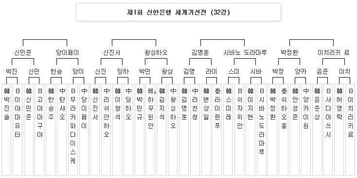 À̾îÁö´Â 8°ÀüÀº 28ÀÏ ¿ÀÀü°ú ¿ÀÈÄ·Î ³ª´µ¾î ÁøÇàµÈ´Ù. ¿ÀÀü 10½Ã¿¡´Â ½ÅÁø¼¿Í ¿Õ½ÌÇÏ¿À, ½Å¹ÎÁذú ´çÀÌÆäÀÌ ÀÇ ÇÑ-Áß °æ±â°¡ ÁøÇàµÇ°í, ¿ÀÈÄ 2½ÃºÎÅÍ´Â ¹ÚÁ¤È¯°ú ÀÌÄ¡¸®Å° ·á , ±è¸íÈÆ°ú ½Ã¹Ù³ë µµ¶ó¸¶·çÀÇ ÇÑ-ÀÏÀüÀÌ ¹ú¾îÁø´Ù. »ó´ëÀüÀûÀº ½ÅÁø¼°¡ ¿Õ½ÌÇÏ¿À¿¡°Ô 4½Â 1ÆÐ·Î ¿ì¼¼ÇÏ°í ½Å¹ÎÁØÀº ´çÀÌÆäÀÌ¿¡°Ô 1½Â7ÆÐ·Î µÚóÁ® ÀÖ´Ù. ¹ÚÁ¤È¯Àº ÀÌÄ¡¸®Å° ·áÀ» 8Àü Àü½ÂÀ¸·Î ¾ÐµµÇϰí ÀÖÀ¸¸ç, ±è¸íÈÆµµ ½Ã¹Ù³ë µµ¶ó¸¶·ç¿Í µÎ ¹ø °Ü·ï ¸ðµÎ ½Â¸®ÇÑ ¹Ù ÀÖ´Ù. ![]() Á¦1ȸ ½ÅÇÑÀºÇà ¼¼°è±â¼±ÀüÀº ½ÅÇÑÀºÇàÀÌ ÈÄ¿øÇÏ°í ¸Å°æ¹Ìµð¾î±×·ìÀÌ ÁÖÃÖÇϸç Çѱ¹±â¿øÀÌ ÁÖ°üÇÑ´Ù. ¿ì½Â »ó±ÝÀº ¼¼°è ÃÖ°í ±Ô¸ðÀÎ 4¾ï ¿ø, ÁØ¿ì½Â »ó±ÝÀº 1¾ï ¿øÀÌ¸ç »ý°¢½Ã°£Á¦´Â ÇǼйæ½ÄÀ» ÅÃÇØ °¢ÀÚ ±âº» 30ºÐÀ» ÁÖ°í, Âø¼öÇÒ ¶§¸¶´Ù Ãß°¡·Î 20Ãʸ¦ ÁØ´Ù. ¢Ã 16°Àü µÑ° ³¯ ´ë±¹ °á°ú(¿ÞÂÊ ¼±¼ö°¡ ½ÂÀÚ) 27ÀÏ (Åä) ¿ÀÀü 10½Ã ùÛ±è¸íÈÆ-Óæ¶óÀÌÁåǪ: 172¼ö ¹éºÒ°è½Â ùÛÇѽÂÁÖ-ñé´çÀÌÆäÀÌ: 181¼ö ÈæºÒ°è½Â 27ÀÏ (Åä) ¿ÀÈÄ 2½Ã ù۽ŹÎÁØ-ùÛ¹ÚÁø¼Ö: 187¼ö ÈæºÒ°è½Â ùÛ½º¹Ì·¹-ìí½Ã¹Ù³ë µµ¶ó¸¶·ç: 246¼ö ¹éºÒ°è½Â ¢Ã 8°Àü ´ëÁø ¹× »ó´ë ÀüÀû(¿ÞÂÊ ¼±¼ö ±âÁØ) 28ÀÏ (ÀÏ) ¿ÀÀü 10½Ã ùÛ½ÅÁø¼ vs ¿Õ½ÌÇÏ¿À: 4½Â1ÆÐ ù۽ŹÎÁØ vs ´çÀÌÆäÀÌ: 1½Â7ÆÐ 28ÀÏ (ÀÏ) ¿ÀÈÄ 2½Ã ùÛ¹ÚÁ¤È¯ vs ÀÌÄ¡¸®Å° ·á: 8½Â0ÆÐ ùÛ±è¸íÈÆ vs ½Ã¹Ù³ë µµ¶ó¸¶·ç: 2½Â0ÆÐ ![]() [16°Àü] ìí½Ã¹Ù³ë µµ¶ó¸¶·ç(½Â)-½º¹Ì·¹.