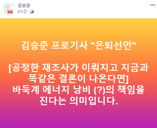 ±è½ÂÁØ °¨µ¶Àº 27ÀÏ ¿ÀÈÄ 1½Ã°æ ÀÚ½ÅÀÇ ÆäÀ̽ººÏ¿¡ "±è½ÂÁØ ÇÁ·Î±â»ç ÀºÅð¼±¾ð [°øÁ¤ÇÑ ÀçÁ¶»ç°¡ ÀÌ·ïÁö°í Áö±Ý°ú ¶È°°Àº °á·ÐÀÌ ³ª¿Â´Ù¸é ¹ÙµÏ°è ¿¡³ÊÁö ³¶ºñ(?)ÀÇ Ã¥ÀÓÀ» Áø´Ù´Â ÀǹÌÀÔ´Ï´Ù."¶ó´Â ±ÛÀ» ¿Ã·È´Ù.
